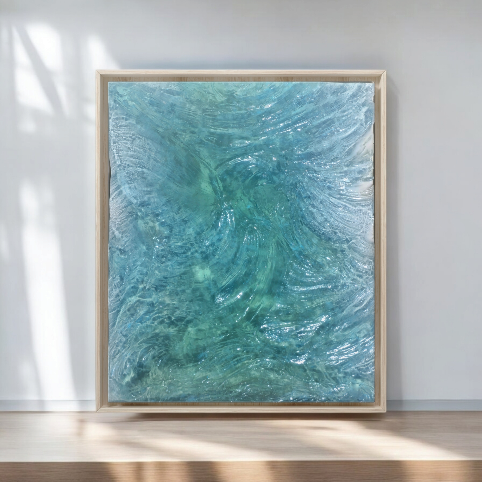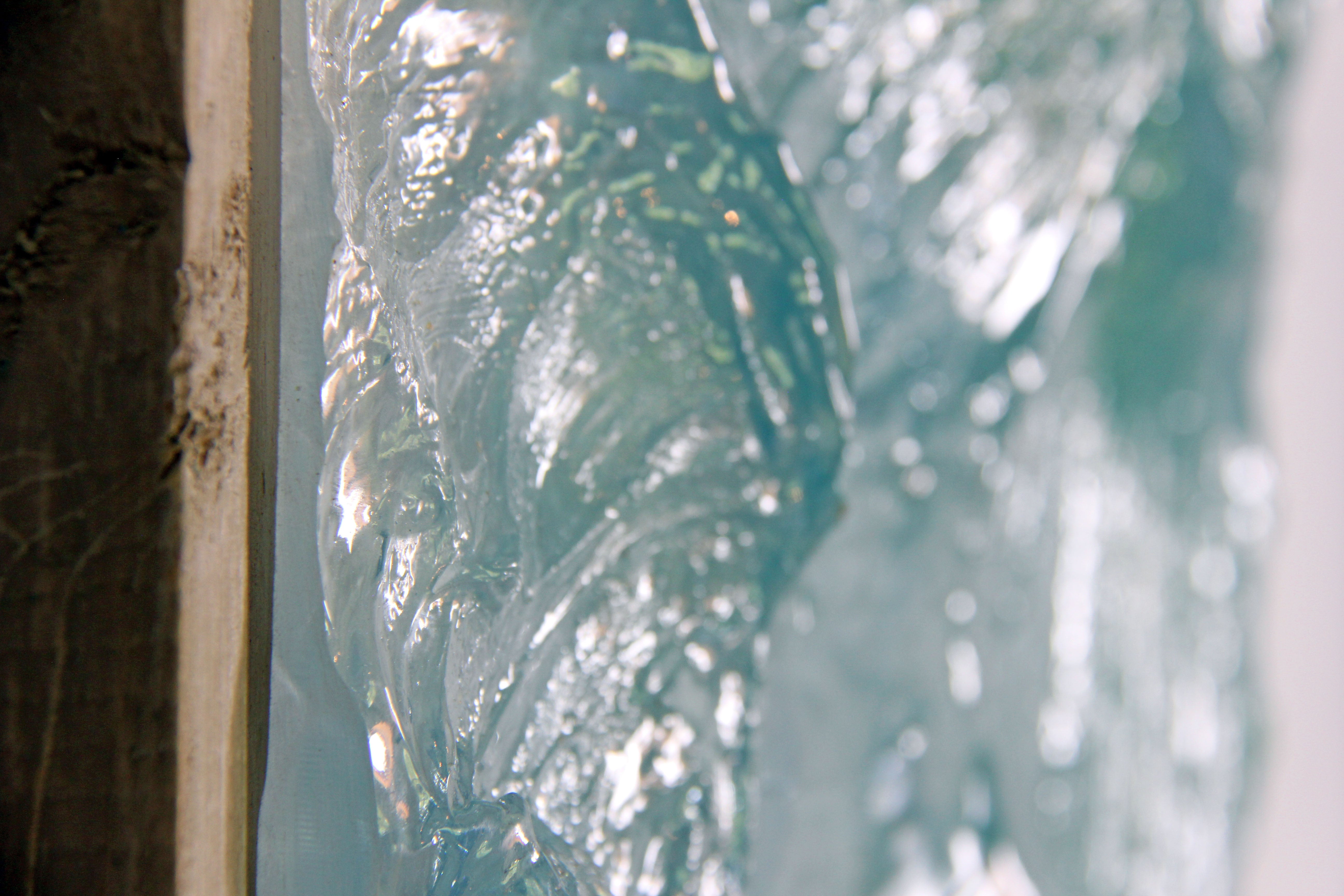 Thick and heavy piece with lots of depth and weight. Brings water to life with a crystal blue/green water flow. Every piece due to the artistic process will a unique collectors item. This piece serendipitously has large trapped air bubbles to even further mimic realistic heavy water flow.