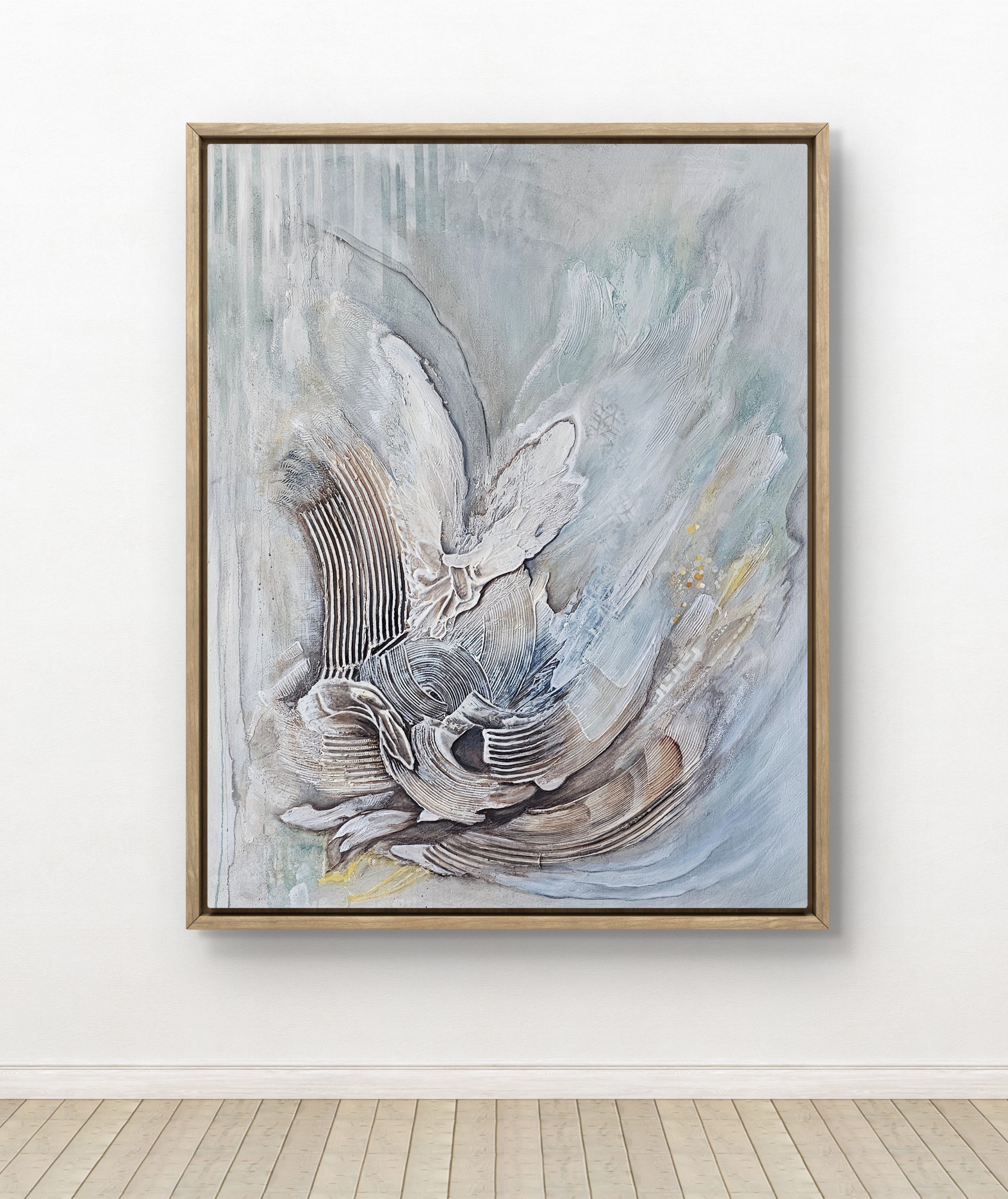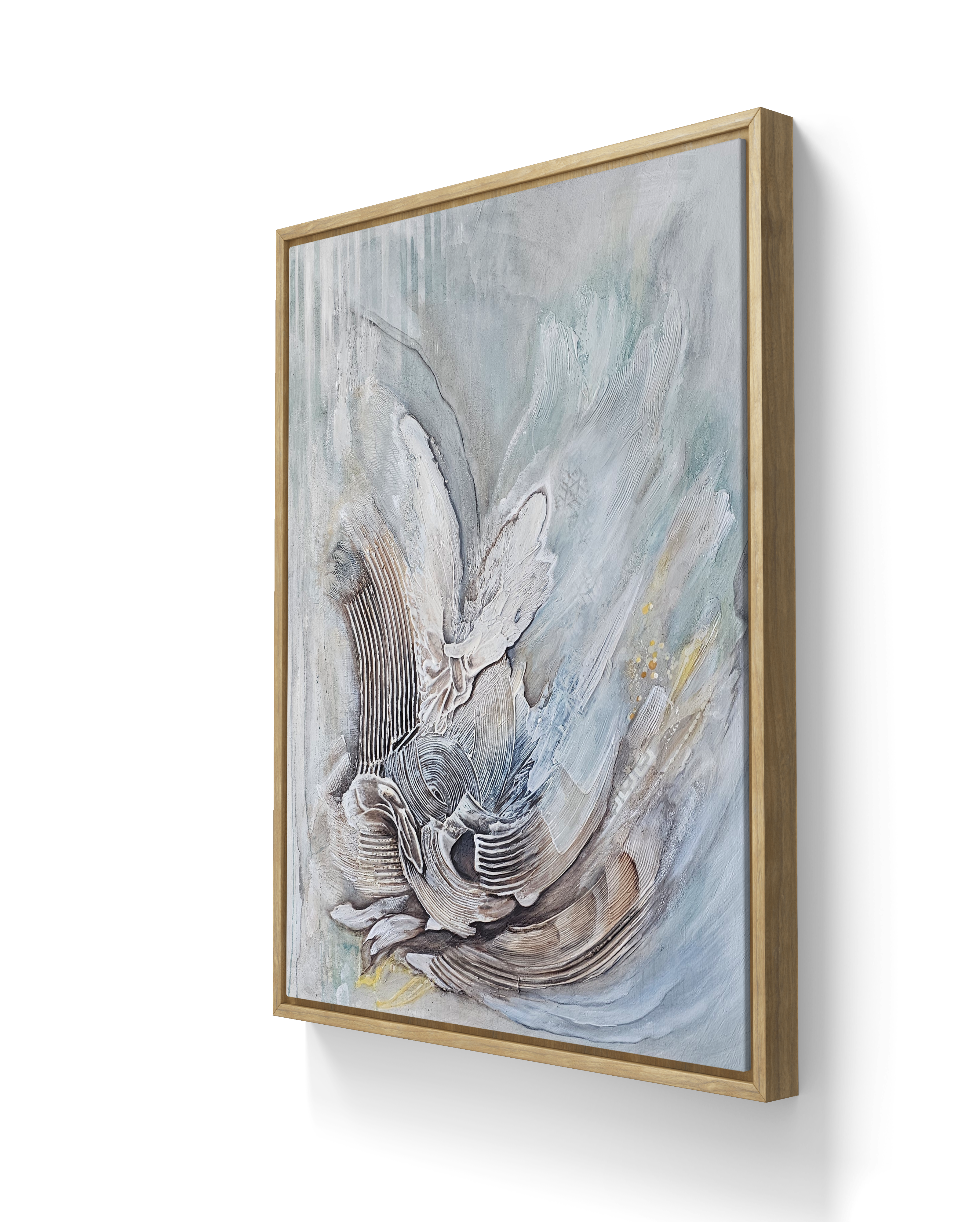 “Alae” — from the Greek word for wing, captures the quiet motion of flight through soft hues of light blue, whispers of white, and gentle touches of yellow. An abstract expression of freedom, lightness, and uplift.
