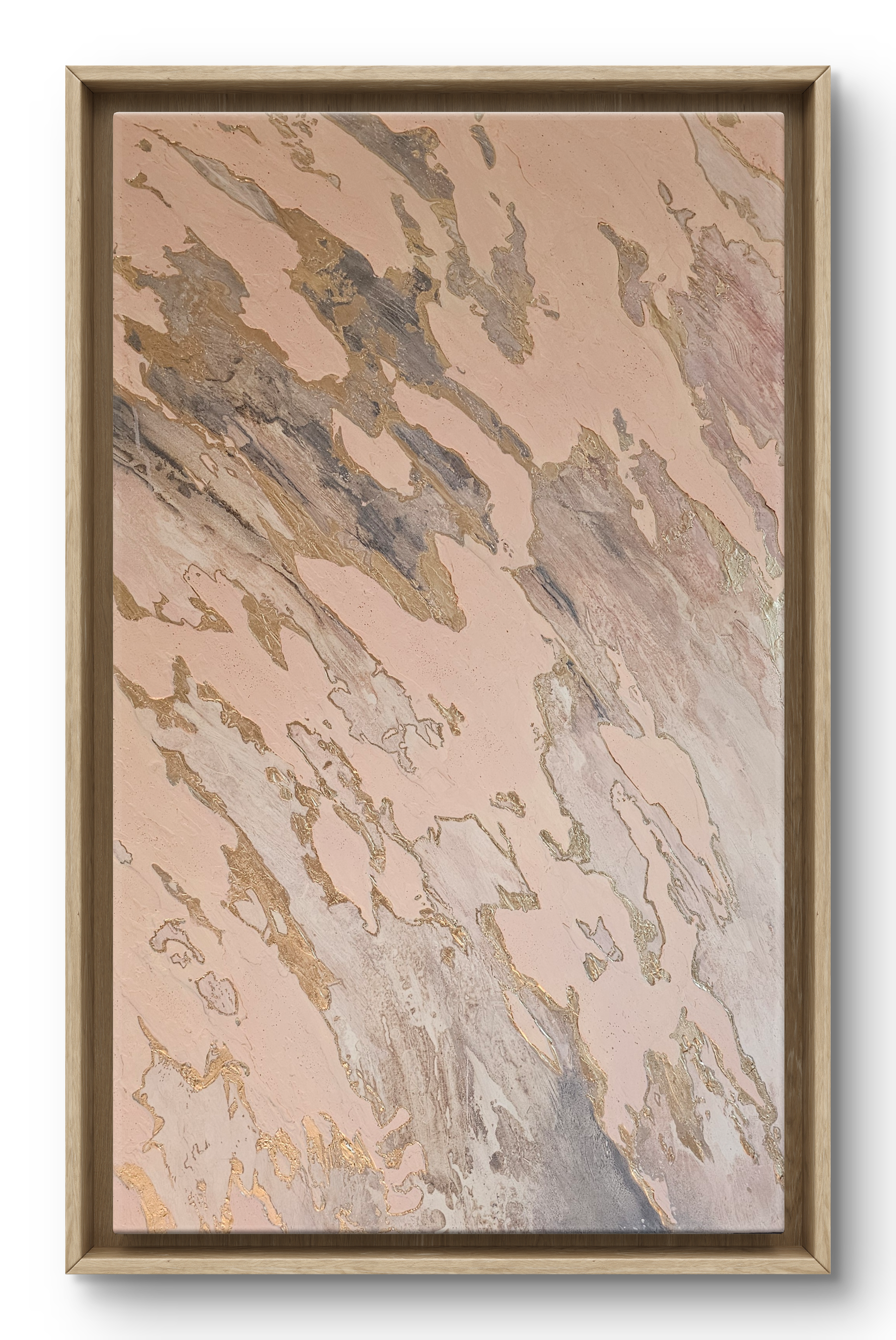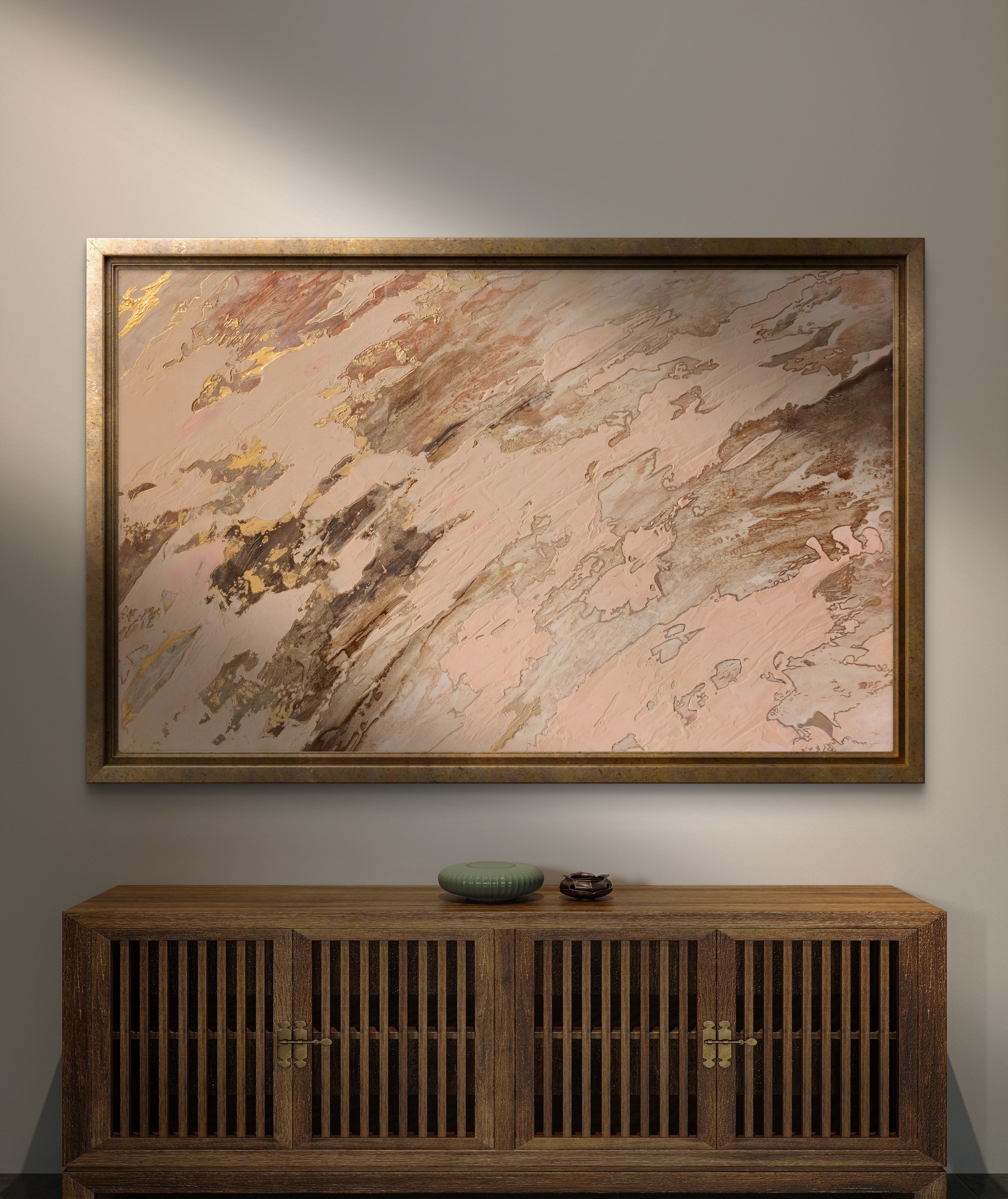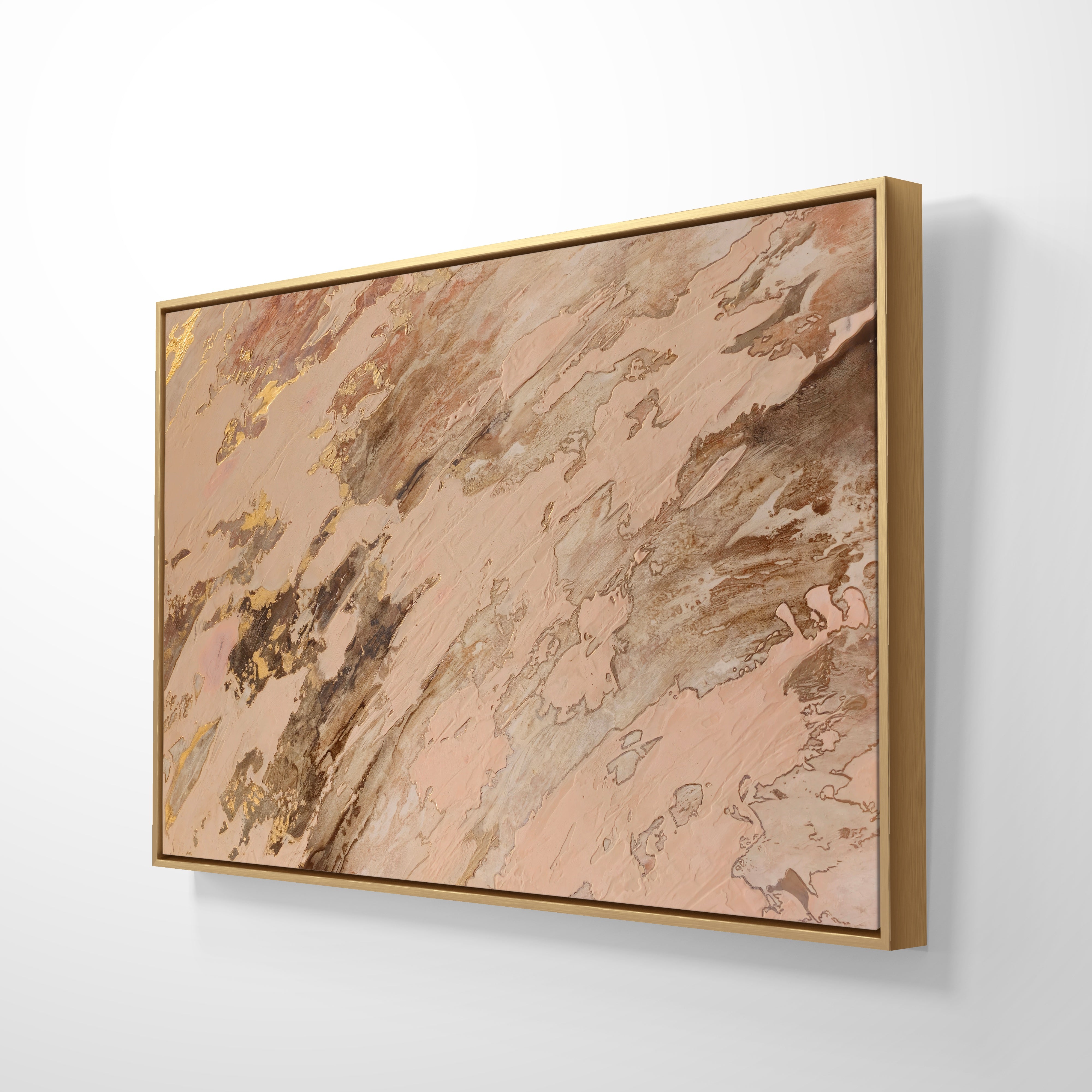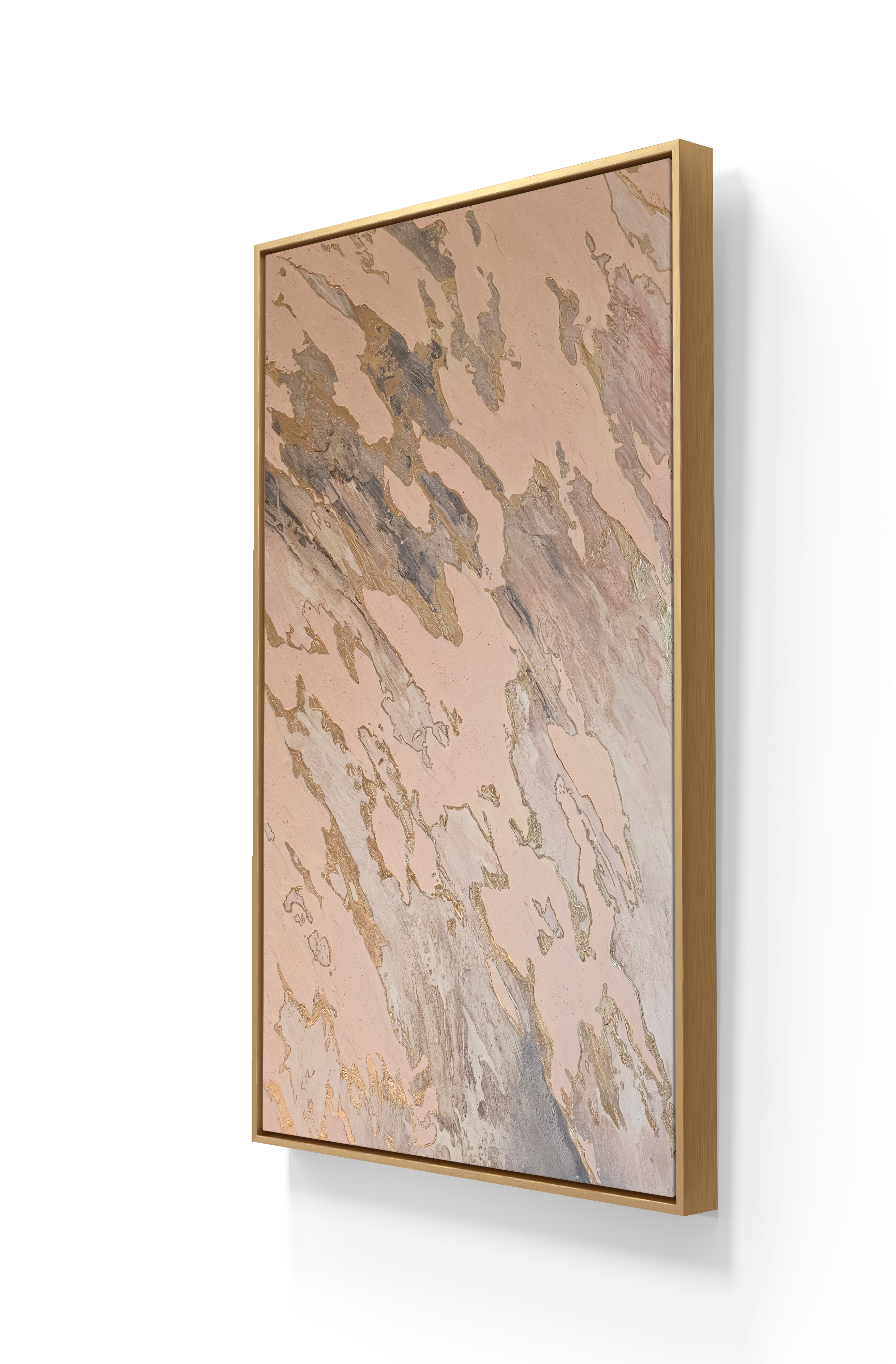 This piece boasts an elegant peach limestone texture accented with gold leaf for a touch of luxury. Its neutral undertones make it a versatile addition to any space. Add a touch of sophistication to your decor with Blush Limestone mixed media. Measures 30 x 48 inches.
