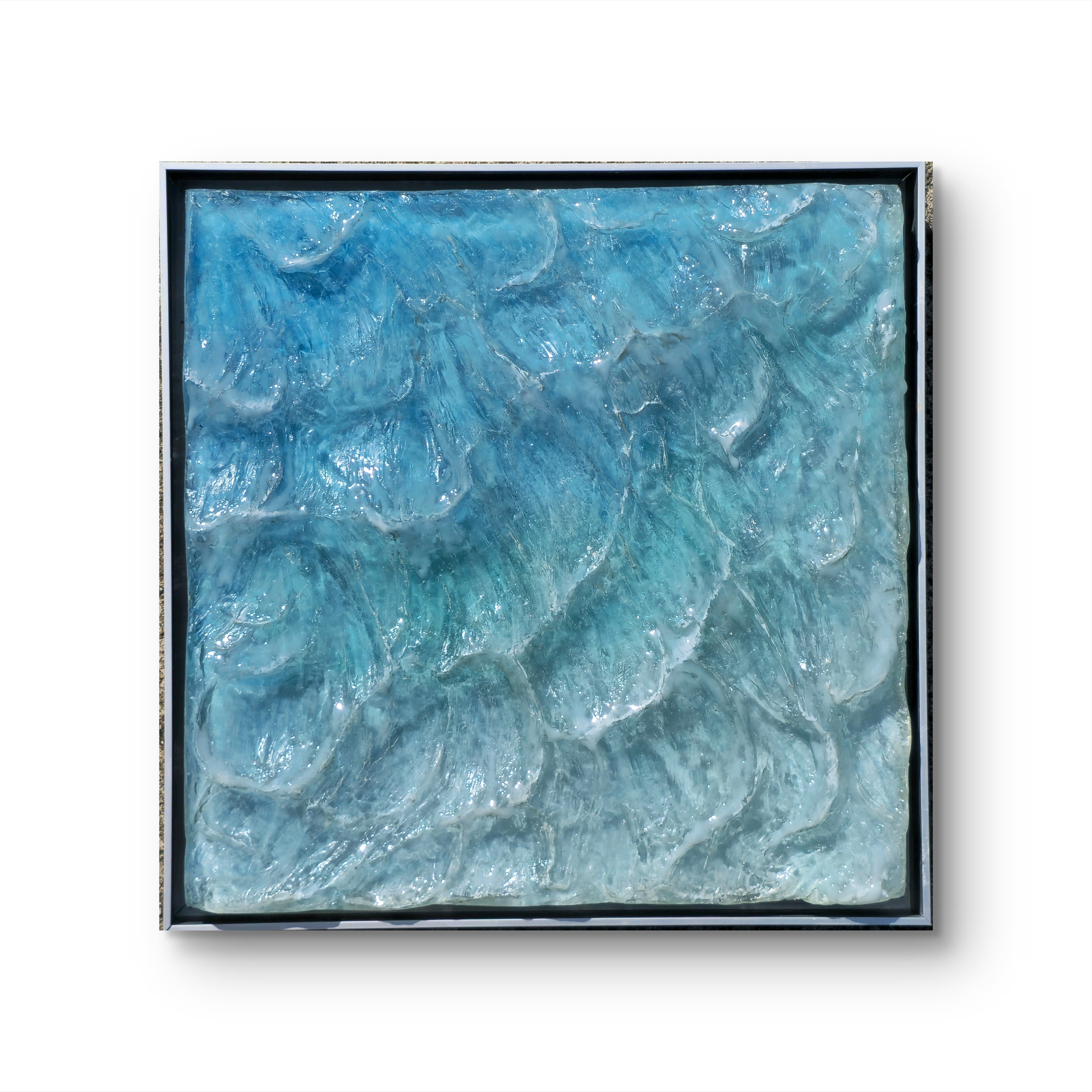 Introducing Cascade, the perfect addition to any home spa experience. With its mesmerizing water flow and stunning ombre blue design, this product will create a calming and relaxing environment. Let the soothing water flow wash away your worries and elevate your at-home pampering routine. Like a water fall, white tip waves cascade into a light blue ombre. 12.5 x 12.5 inches outside dimension.  Ships with a silver metal floating frame.