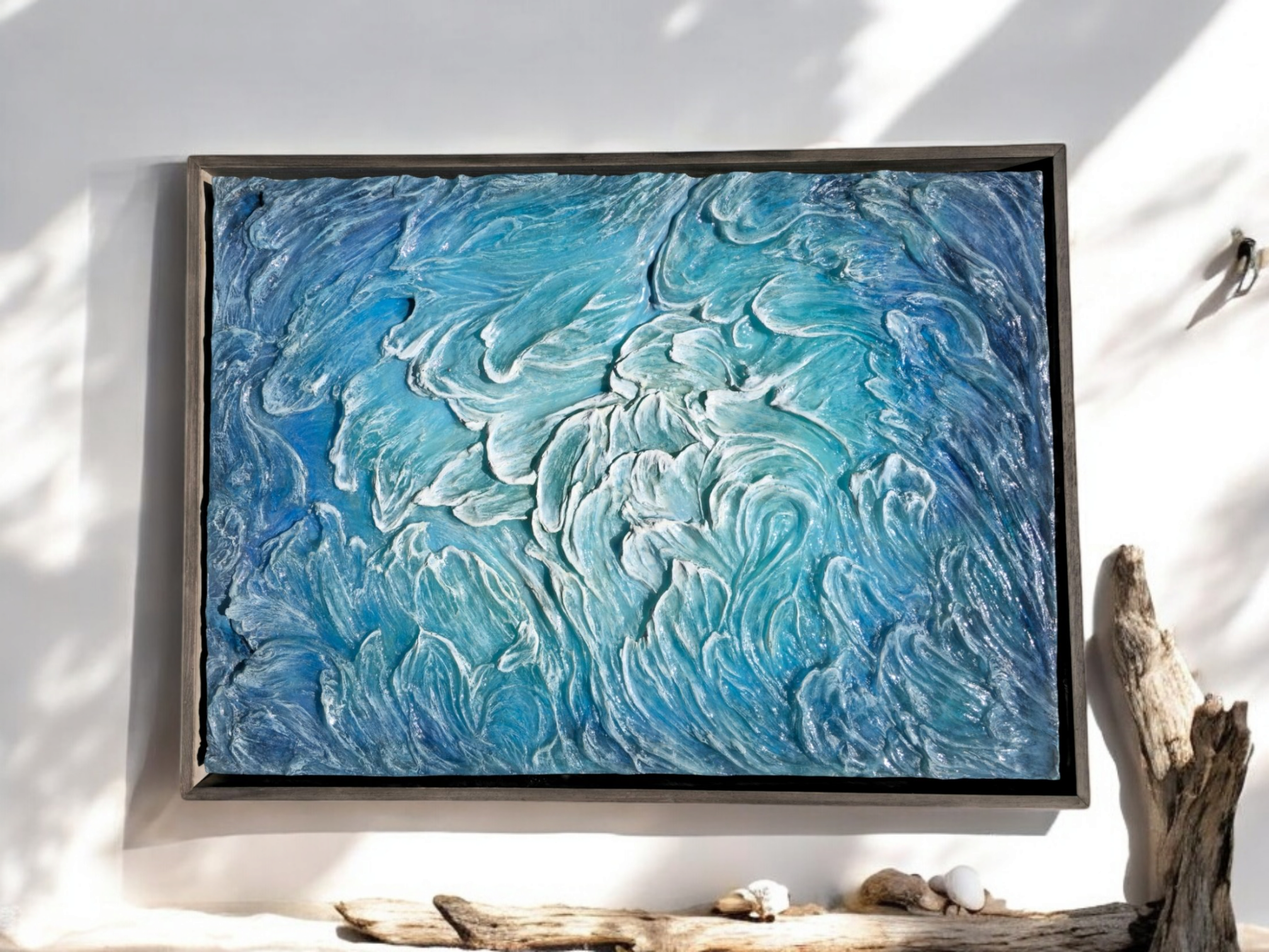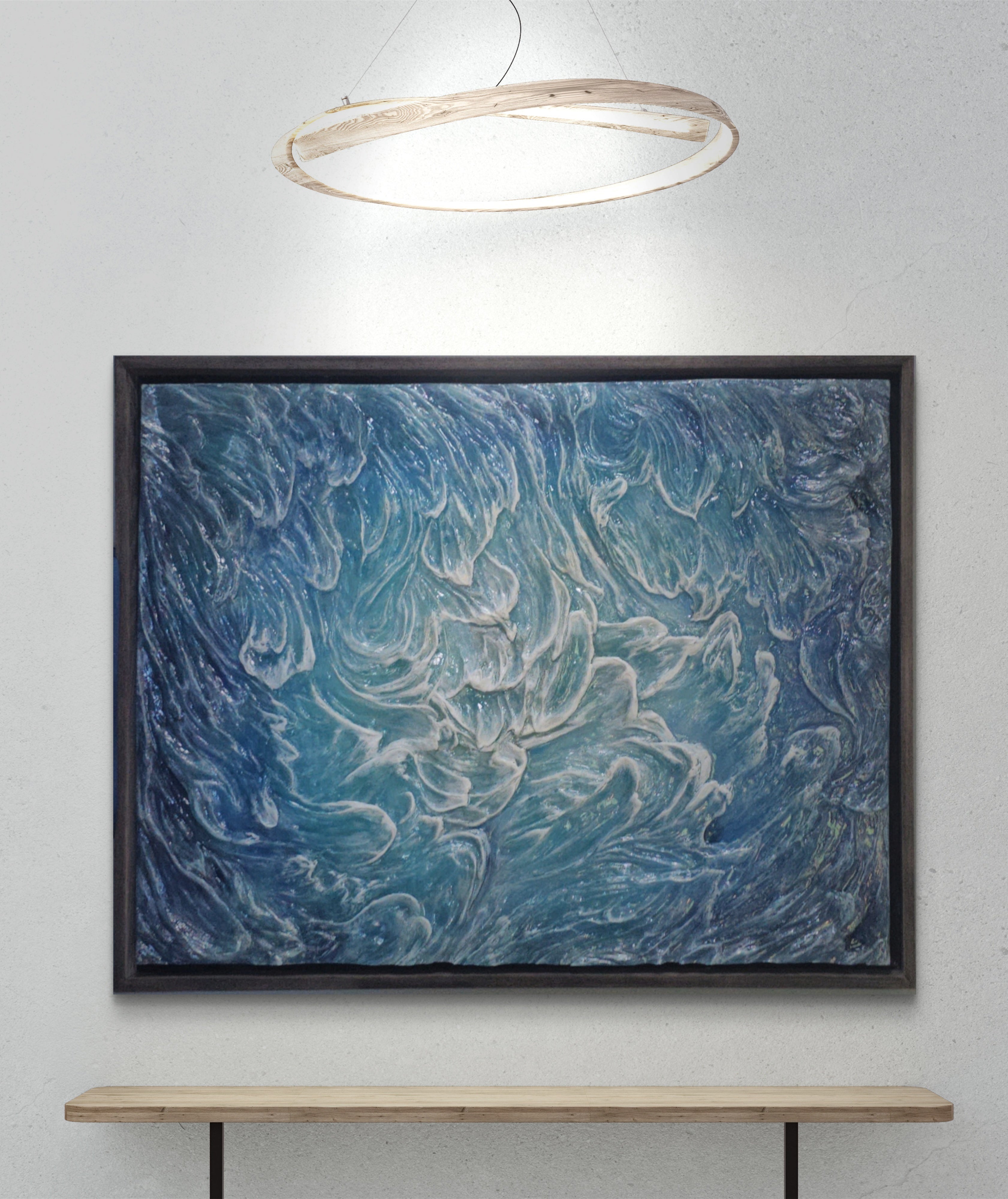 Ceaseless Surf captures the beauty of endless waves in stunning detail. Experience deep blues, crashing white caps, and the elegant shapes of ships framed and measures 3 ft x 4 ft . Admire this water sculpture and let your mind drift to the open sea. Ships framed.
