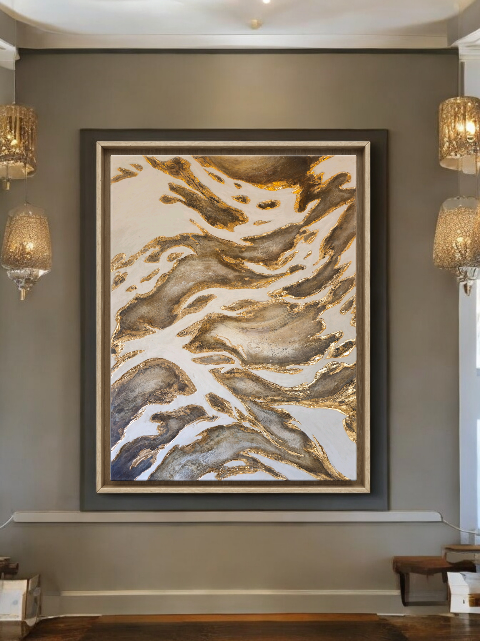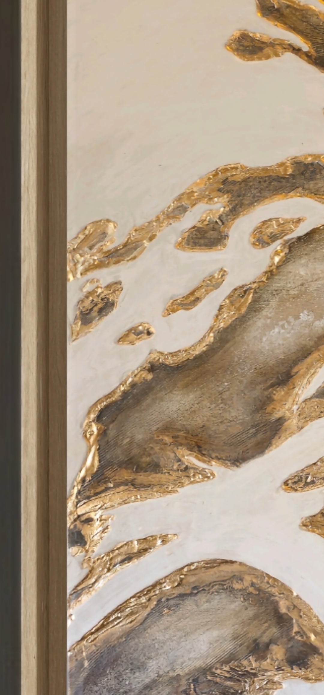 Expertly crafted, Gilded features a deep, intricate texture, enhancing its one-of-a-kind mixed media artwork. The velvety taupe creamy top adds dimension to this stunning piece, making it a unique and luxurious addition to any space. Measures 30 inches x 40 inches.