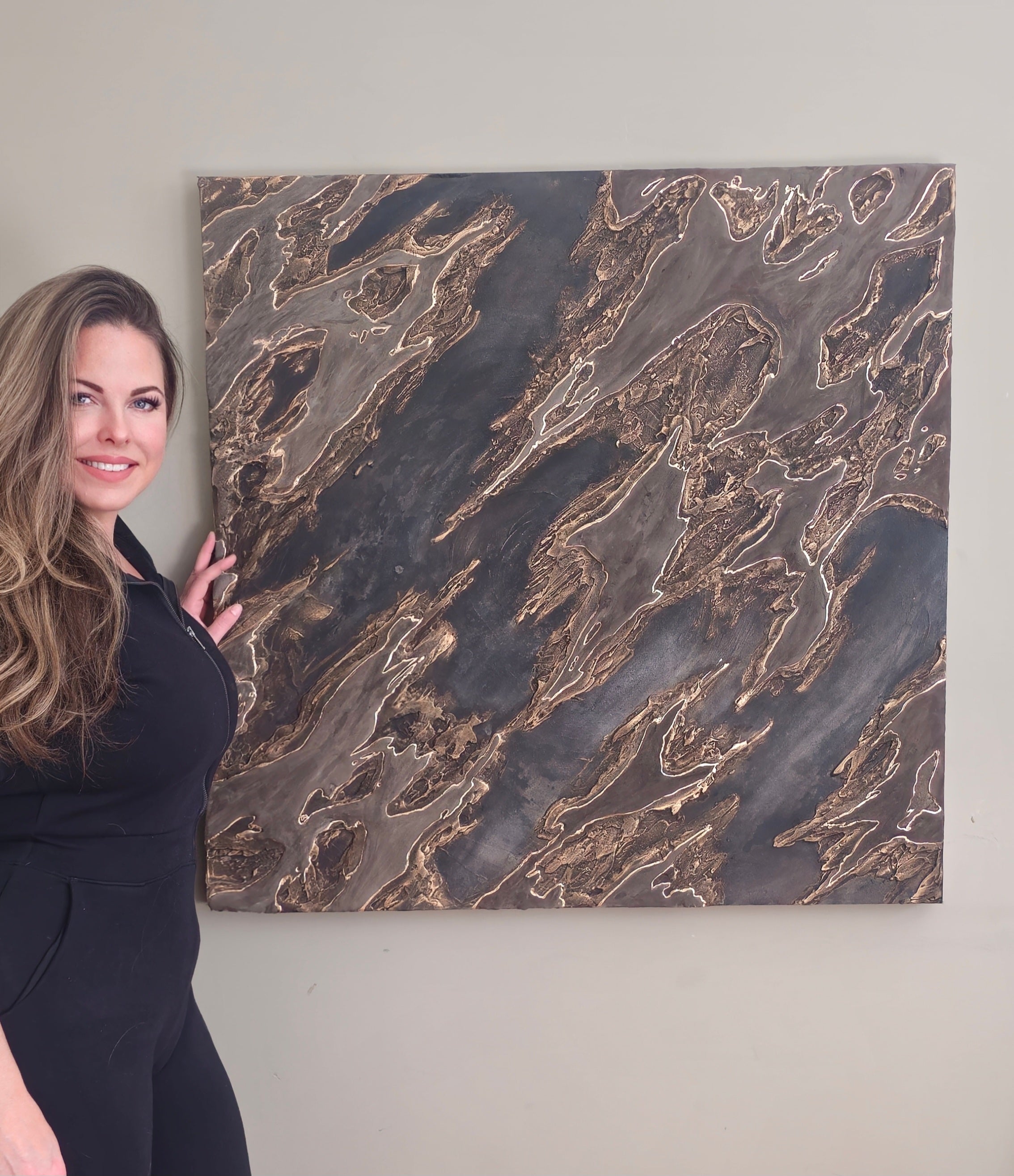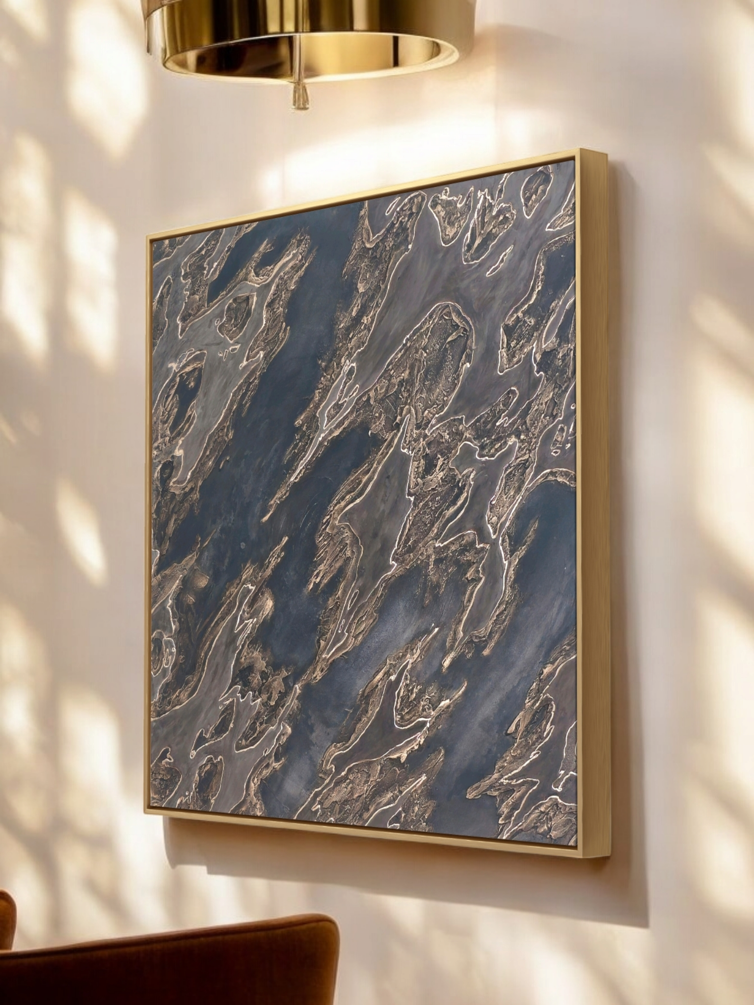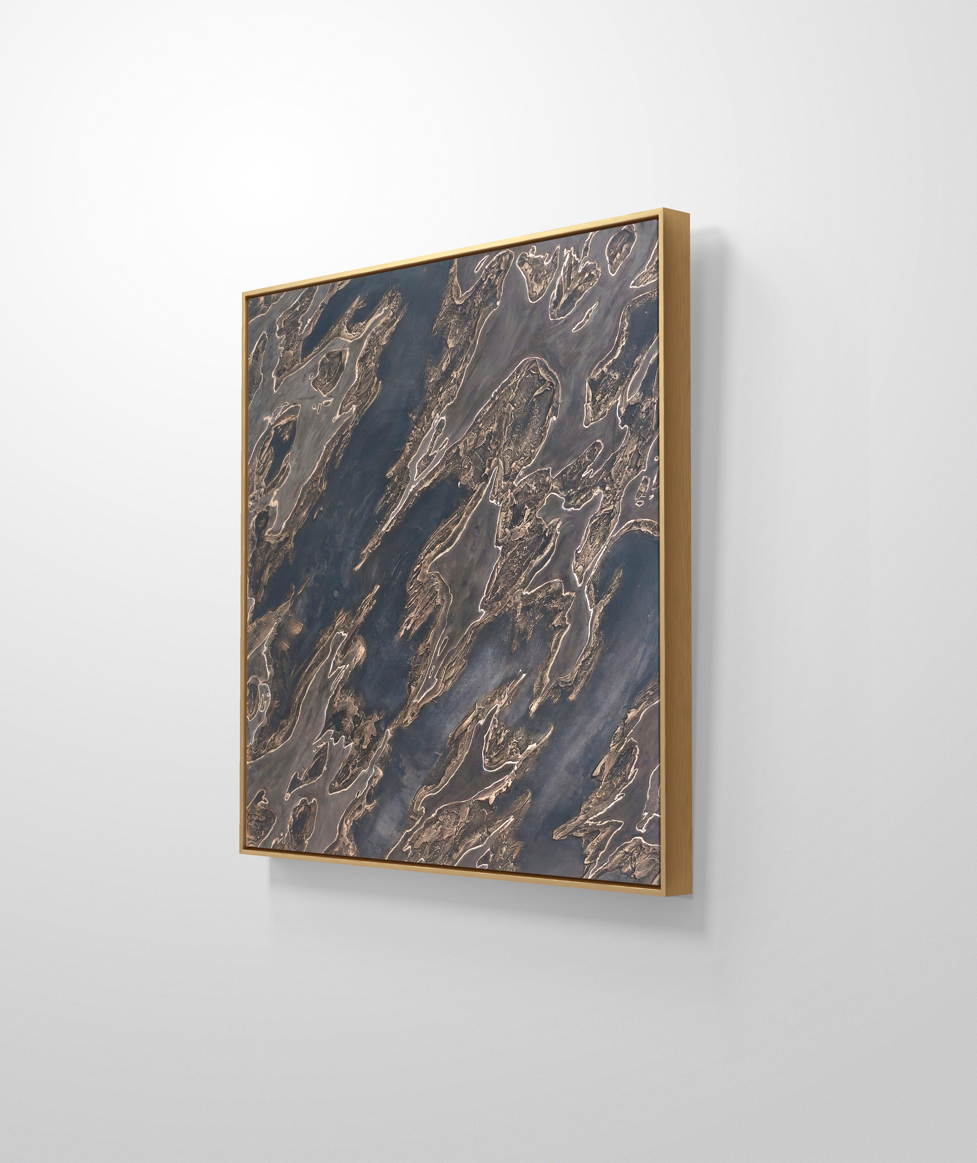 Enhance your space with the luxurious touch of our Leather and Leaf. The velvety brown and black tones, highlighted with gold accents, add richness and depth to any room. The intricate texture exudes a masculine yet dramatic vibe. Ships unframed for maximum customization options. 36 x 36 inches.